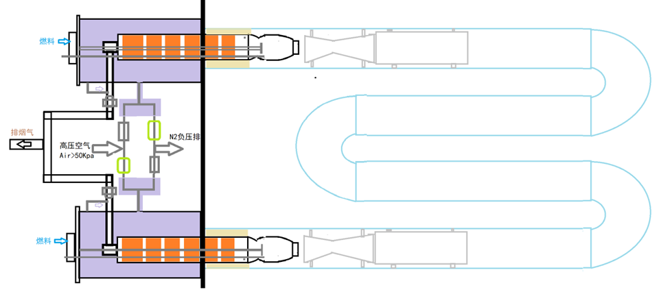 A:采用大于50Kpa的空氣管路(比如壓縮空氣或高壓風(fēng)機(jī))通過(guò)分子篩變成純氧助燃煤氣。一方面提高煤氣的燃燒溫度,可加熱范圍實(shí)現(xiàn)在燃燒溫度850-1400度之間,實(shí)際爐膛加熱溫度950度左右可調(diào)節(jié)。由于空氣中的N2不進(jìn)入爐膛,煙氣量減少70%,煙氣以CO2以及水蒸氣為主要成份。排煙溫度在100C以下,可以在后端增加設(shè)備實(shí)現(xiàn)煙全回收;并可現(xiàn)實(shí)純N2的排放并收集。